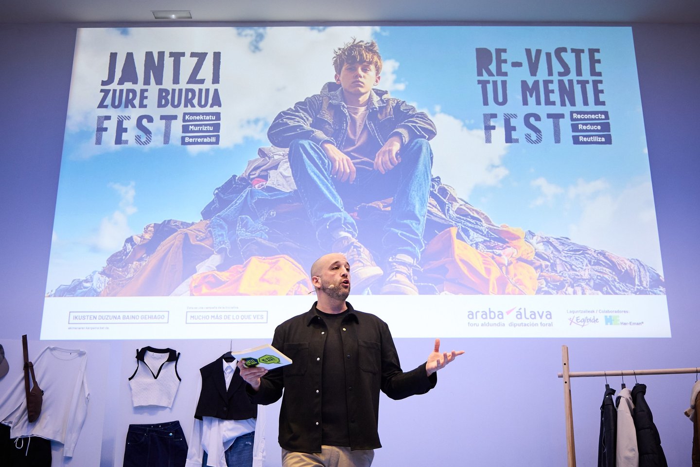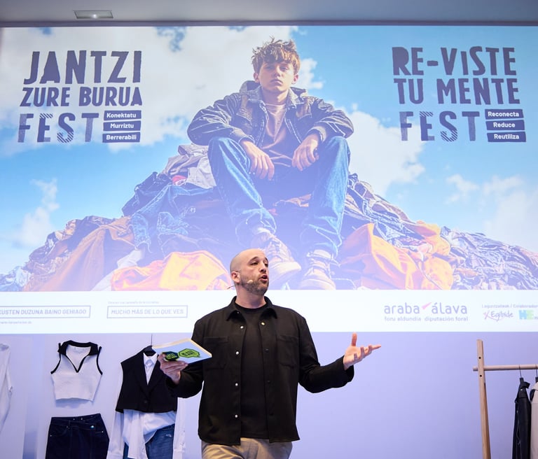 Presentación del final de la Camapaña Reviste tu Mente, Jantzi zure Burua Fest, sobre una correcta gestión del residuo textil. Dinamización del desfile de moda e intracción con el público.
