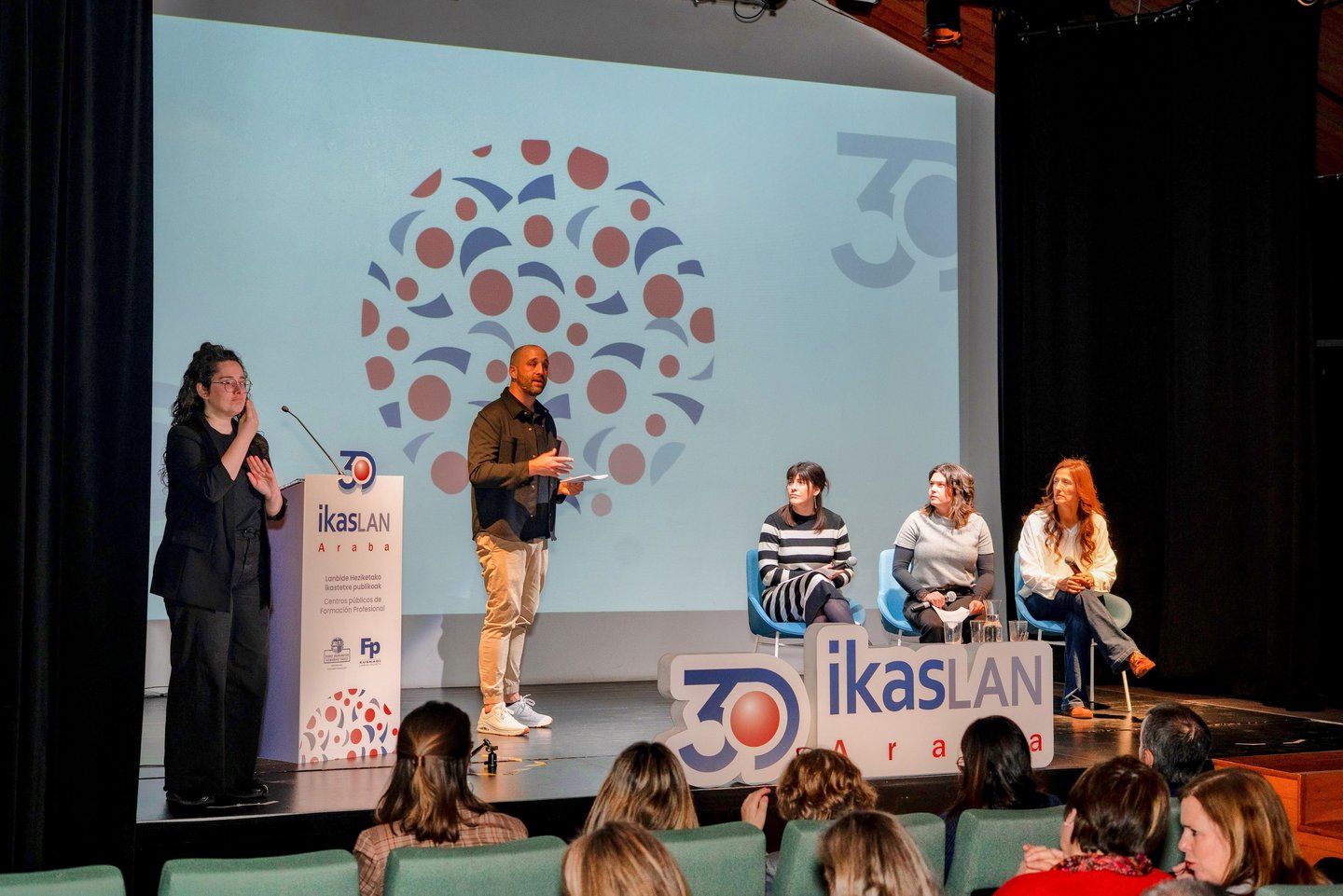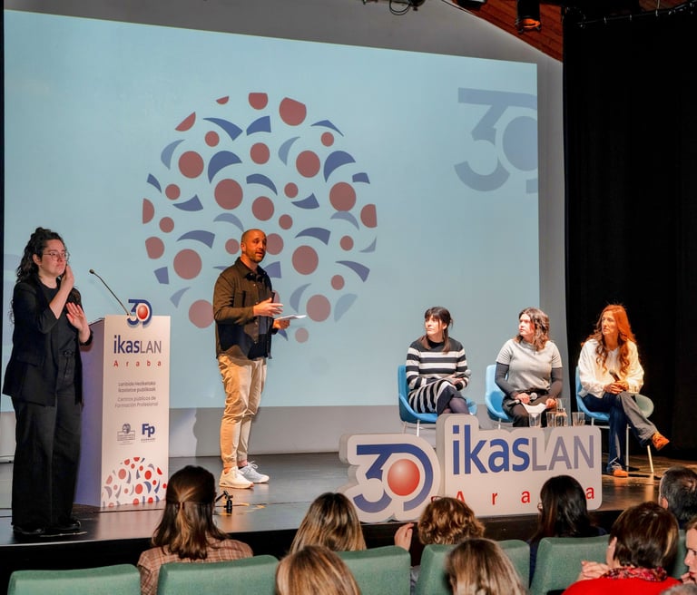 Presentación y dinamización del acto institucional con motivo del 30 aniversario de Ikaslan Araba, acompañando el desarrollo del evento y la interacción con las personas asistentes.